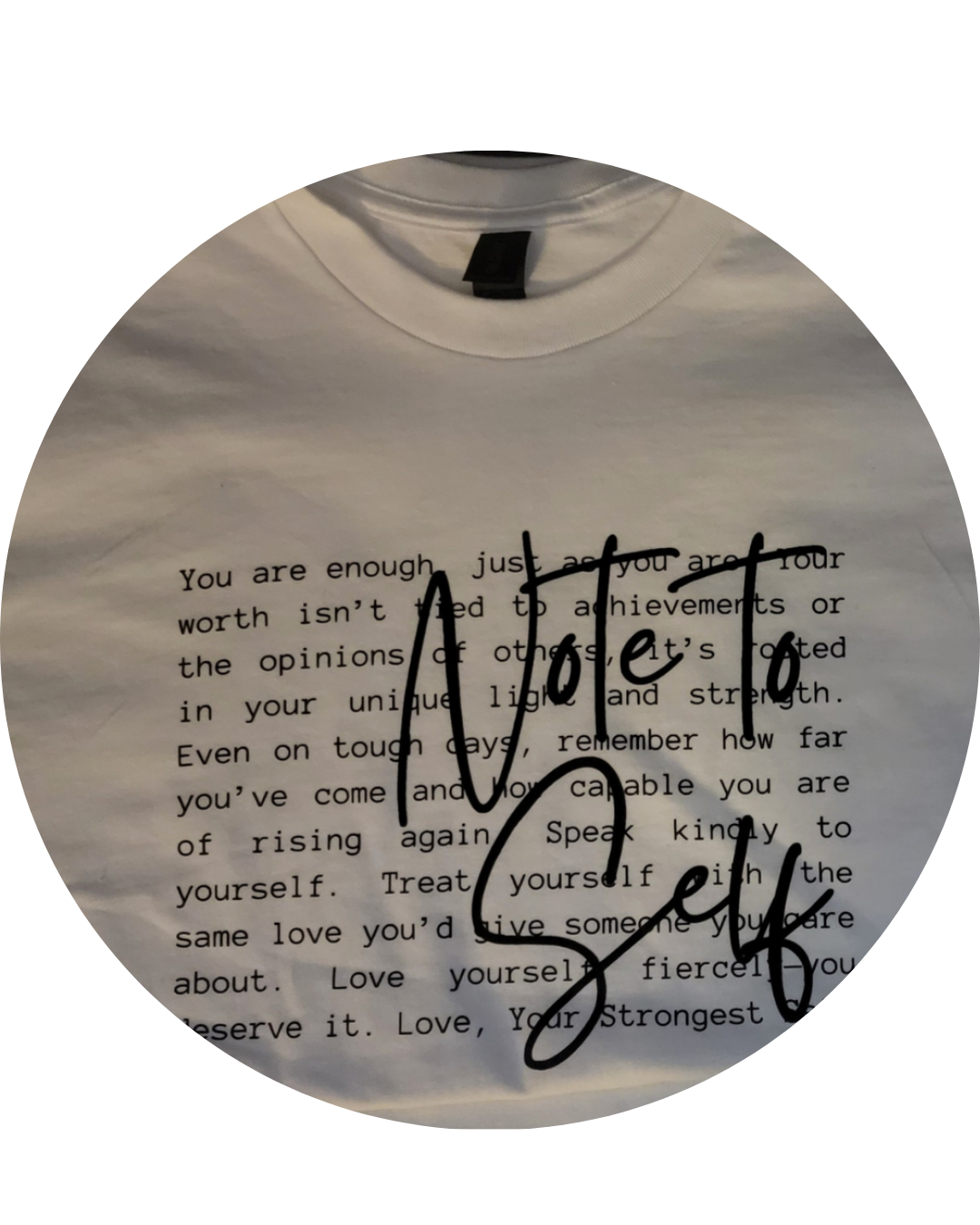 A wearable affirmation, this tee carries a powerful reminder to be gentle with yourself. Featuring a background of uplifting text and a bold “Note to Self” overlay, it’s designed for anyone who needs encouragement to rise, love, and keep going.